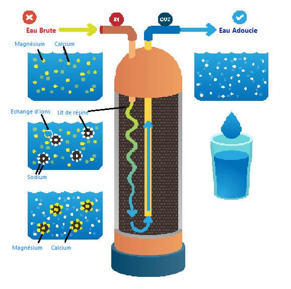 - En traversant l’adoucisseur, l’eau dure est mise en contact avec une résine.